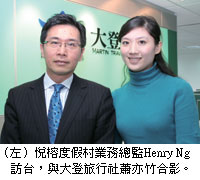 日前,悅榕渡假村業務總監Henty Ng來台針對悅榕民丹/普吉/麗江/香格里拉做介紹,講得一口流利英文、會聽中文的Henry表示,「一般來說悅榕度假村的淡旺季都不明顯,但比較特別的是悅榕麗江在每年2~7月是淡季,建議業者在銷售上可以多做推廣。」大登旅行社目前推出的麗江產品有4天3夜搭配澳門航空的行程,因為週二、六對飛的緣故可安排4天3夜或5天4夜;或搭配麗江香格里拉,有花園別墅+藏式牧舍5天4夜雙城記~雙人房每人58,900元起的產品。特別是麗江的部分入住2晚以上就有升等的優惠,例如花園別墅可直接升等至豪華花園別墅。