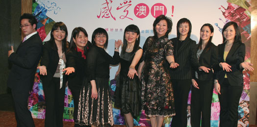 ▲熱情有勁、活力四射的澳門旅遊局團隊。(左起)澳門特別行政區政府旅遊局公關歐旭倫、市場處錢淑儀、行銷經理趙玉勤、市場處處長霍慧蘭、推廣廳廳長謝慶茜、台灣代表梁吳蓓琳、傳媒關係劉鳳池與專員伍家儀。