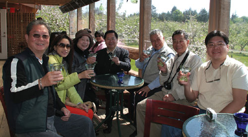 ▲一行人前往蘋果西打製作工廠考察、品酒,當地正值蘋果花季,滿樹蘋果花讓人倍感心曠神怡。(左起)洋洋旅行社董事長韓家威、加拿大卑詩省旅遊局台灣區經理張碧珊、鳳凰旅行社董事長夫人吳明雪與董事長張金明、錫安旅行社董事長吳西謙、理想旅運社董事長蔡榮一與中華航空台北分公司客運營業部業務代表陳宣宇。