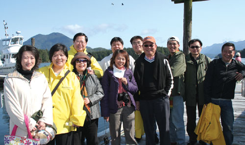 ▲考察團特別前往Tofino賞鯨,據了解,在此之前,少有台灣人前往當地。(左起)錫安旅行社經理任婉瑜、易遊網旅行社高雄分公司協理施桂瑛、鳳凰旅行社董事長張金明夫妻、新進旅行社專業諮詢許嘉容、中華航空台北分公司客運營業部業務代表陳宣宇、洋洋旅行社董事長韓家威、加拿大線控副理張世棠、理想理運社企劃副理張允冠、易遊網旅行社國外旅遊三處產品主任陳彥凱與廣播節目主持人比利。