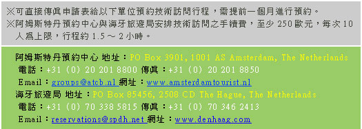 此次對同業召開的技術參訪團說明會,主要是為了將荷蘭精緻旅遊的訴求彰顯,並且與當地旅遊局攜手合作,規劃了像是廢棄物與環境、都市規劃、農業與園藝、港口、航太科技、工業技術、教育、社會福利等一系列主題,做為業者服務不同旅遊需求的客戶可做為參考的依據。近年來庫肯霍夫鬱金香國家公園,就是一個很顯著的例子。
