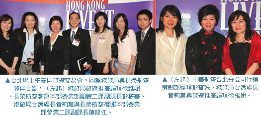 至於台灣部分,港旅局首度從南往北舉辦交流會,並首次在台中舉辦,黃莉惠說,這是因為港旅局發現過去視為二線市場的中南部地區擁有龐大潛在客源,例如去年中部地區前往香港旅客就佔全台灣前往香港旅客總人次的11~12%,而包括台中與高雄旅展香港產品銷售狀況,都有漂亮成績,顯示近期港旅局在兩地推廣逐漸開花結果。