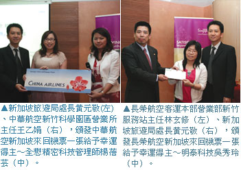 新加坡旅遊局與麗星郵輪、中華航空、長榮航空於5/30新竹舉辦獎勵旅遊企業說明會,會中不但有趣味賓果遊戲,還有機票抽抽樂。新加坡旅遊局處長黃元敬指出,「第一次到訪新竹,希望給予各大企業一個嶄新的旅遊方式,而新加坡旅遊局耗費巨資開發旅遊景點及建設規劃,就是希望能提供更舒適的時尚購物娛樂空間,讓來自全球的商務人士均能在最佳環境之下進行業務洽商與休閒活動。」
