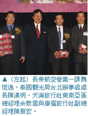 泰國觀光局台北辦事處處長陳漢明表示,「台灣前往泰國人數一直占海外觀光客的前5名,去年台灣人前往泰國旅遊人數大幅成長40%,為了拓展台灣市場及提升與台灣業者的交流,泰國觀光局特地在晶華酒店展開泰國旅遊推廣交易會,促進泰國與台灣業者的合作,並邀請長榮航空營業一課魏恆逸、康福旅行社副總經理陳振宏、天海旅行社東南亞區總經理余敷雲,為泰國觀光產品及去年旅客增加狀況向到場旅行社做報告。」