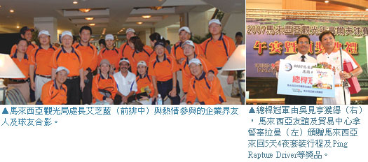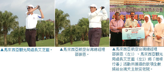 2007馬來西亞觀光年,為推廣馬來西亞多元旅遊風貌,及豐富的大馬高爾夫球旅遊資源,馬來西亞觀光局特別與馬來西亞航空公司及山富、大林、富邦、全龍、良友、金華、東南及非凡等8家旅行業者合作,邀請約150多位企業界友人、球友與旅行同業共同參與5月23日於林口美麗華球場舉辦的高爾夫球友誼賽。活動中並舉辦「推桿行善」活動,球敘兼行善,將所得捐贈予台灣天主教安老院。此外,高爾夫球活動提供十分優渥的獎項,包含總桿冠軍獲得馬來西亞來回5天4夜套裝行程,淨桿獎獲得台北—吉隆坡或台北—沙巴來回機票,其他獎項有美麗華球場1年會員資格及星裕國際股份有限公司所提供的高級高爾夫球用品等多項獎品。