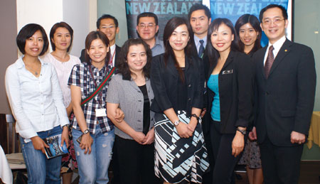 ▲(前排左起)紐西蘭打工度假玩家許媛婷、時報旅遊個人旅遊部協理賴沛淇、長榮航空營業本部團體一課侯乃尤、長榮航空營業本部團體一課課長古京玉、紐西蘭觀光局台灣區經理劉碧珍、長榮航空營業本部營業二課副課長陳龍江;(後排左起)康福旅行社產品部紐澳線協理王佳雯、雄獅旅行社產品部紐澳線主任吳永富、康福旅行社產品部紐澳線副理陳政宏、長榮航空營業本部團體一課沈昌禾、燦星旅行社產品經理黃久久。