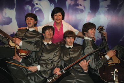 ▲考察團期間安排業者使用港旅局針對海外旅客設置的套票,搭乘纜車前往太平山頂、並進入香港杜莎夫人蠟像館參觀,讓業者親身體驗快速取票的便捷。圖為香港旅遊發展局台灣處長黃莉惠在蠟像館與其喜愛的The Beatles樂團成員的蠟像合影。