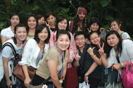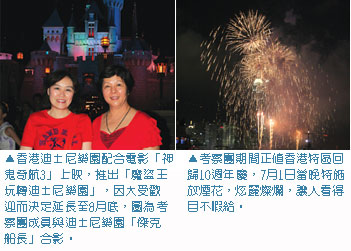 ▲香港迪士尼樂園配合電影「神鬼奇航3」上映,推出「魔盜王玩轉迪士尼樂園」,因大受歡迎而決定延長至8月底,圖為考察團成員與迪士尼樂園「傑克船長」合影。