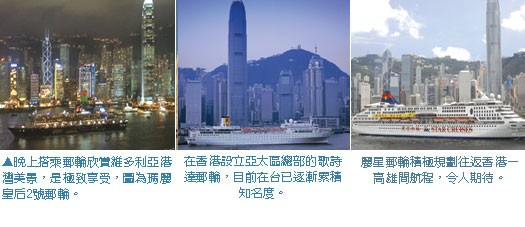 目前包括世界前三大郵輪品牌都陸續進駐香港,規劃由香港出發或停靠香港的行程,洪美欣說,為發展郵輪市場,港旅局積極與郵輪公司合作,遊說開啟造訪香港的航程,更深入世界郵輪中心—邁阿密,在當地地接社協助下,與郵輪公司頻密互動、增取合作空間。而對旅客部分,則建議旅客可延長造訪香港的停留時間,除了一般觀光、採購外,也可搭船體驗郵輪樂趣。此外,香港政府也在原來的啟德機場建設新碼頭,第一與第二個停靠點分別預計於2012年、2015年落成,連同目前海運大廈既有的停靠點,未來香港將至少有4個停靠點。值得注意的是,麗星郵輪年底可能推X高雄—香港產品,屆時香港旅遊不僅有新玩法,又將牽動台灣旅遊香港的訪客結構。