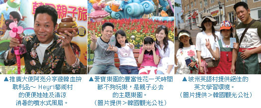 此外,全世界最大的英語村落~坡州英語村是一個真正社區,有數百人在此居住、飲食、睡覺、購物與學習,裡面有酒吧、書店、麵包店、餐館、銀行、電影院,甚至市政府,在裡面從check in就要開始說英文才能拿到入村的Passport,也要用英文才能買東西。阿亮不好意思的說,「在入口處,我就先裝喉嚨痛失聲,結果一下就被女兒識破,馬上現聲搶救,看著女兒們在全英語的環境中邊學邊玩,發現韓國除了很適合帶小朋友來玩,還有增進英文能力的意外收穫。」
