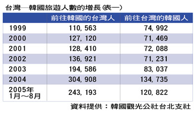 獎勵旅遊、會議旅遊占各國觀光局、駐外單位旅遊市場中,即為重要的一塊。韓國因為距離台灣近的優勢,這幾年來積極地推展獎勵、會議旅遊。特別是去年9月台韓復航後,台韓之間的距離更為縮短與便捷,台韓間的觀光人潮呈倍數成長(見表一)。