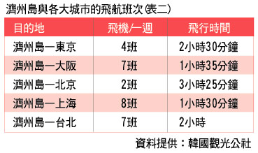 金鐘熙表示每年造訪濟州島的外國旅客數約為30萬,其中來自中國、台灣的旅客約占1/2,其次為日本的1/3。因此,濟州國際會議中心,除了台北外,也將香港、上海、北京、東京視為未來主要的目標市場。而這些主要市場除了香港與濟州沒有直航班機外,台北、上海、東京、北京皆有班機直飛,且飛行時間皆不長(見表二),因此成為推廣會議旅遊重點市場。而加上這幾個國際都會的人民,在看膩了櫛比鱗次的高樓大廈後,對著有山光水色的濟州島應有著憧憬感。此外,金鐘熙更強調,濟州島明年國外旅客人數的目標為40萬,而主要市場則鎖定在台灣與中國市場方面。