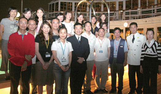 台灣業者於麗星郵輪寶瓶星號進行考察之旅(前排左起) 中華航空台北分公司客運營業部香港/大陸/菲律賓線主任李建勳、 捷利旅行社業務經理趙燕中、香港旅遊發展局旅遊推廣助理主任賴儀穎、中華航空高雄分公司營業部業務代表任立桓、麗星郵輪業務部經理劉曉寧、麗星郵輪大中華及韓國區營業及市場推廣副總裁吳明發、永業旅行社業務部協理潘麒麟、良友旅行社國外部副總經理蔡長吉、良友旅行社高雄分公司副協理陳進富、麗星郵輪飯店經理盛錦龍、麗星郵輪產品拓展及宴會/項目統籌經理江麗茵;(後排左起)蘋果旅行社協理陳碧芬、上順旅行社高雄分公司業務副理莊慧君、理想旅運社塗巧?、上順旅行社行銷部副理陳美伶、理想旅運社高雄分公司業務副理張秀慧、新進旅行社副理楊惠媚、大登旅行社高雄分公司旅遊諮詢張怡芬、新進旅行社專業諮詢陳芊華、大登旅行社業務部旅遊諮詢黃詩容。