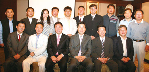 ▲11/2舉辦 「2007 韓國滑雪嘉年華」活動前晚宴,邀請韓國代表團以及台灣業者進行滑雪活動說明會。韓國觀光公社台北支社支社長徐英忠(前排右3)、韓國代表團團長~陽智度假村常務柳賢雄(前排右2)、喜麟旅行社副總經理邱國勝(後排左1)、豐年旅行社經理熊明昌(後排左2)、台航旅行社東北亞線控副理張紫琳(後排左3)、興安旅行社總經理欒興秀(後排左6)、中國時報旅行社總經理趙政岷(後排左7)及新奇旅行社總經理王振益(後排右1)。