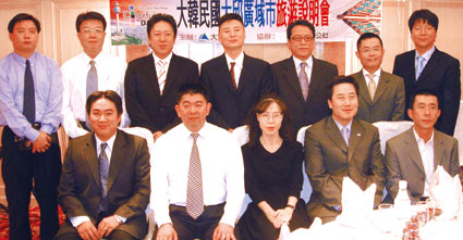 ▲(前排左起)大都會旅行社協理張格維、立益旅行社副總經理詹林家、 大邱市政府觀光企劃部處長金順姬、韓國觀光公社台北支社長徐英忠、京城天下旅行社總經理吳志健;(後排左起)華邦觀光台北辦事處經理盧世豐、韓國慶安旅行社代表王保強、華邦觀光社長韓武良、興安旅行社總經理欒興秀、慶安旅行社代表王德信、喜麟旅行社副總經理邱國勝、慶北觀光開發公社弘報室課長孫援浚。