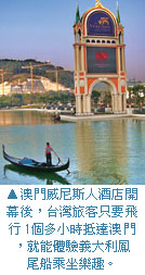威尼斯人酒店的開幕,成功拉抬澳門旅遊聲勢,因此衛斯理認為若預算較為寬鬆,不妨考慮入住於此,他說,「飯店陳設金碧輝煌,讓人大開眼界。而這裡能乘坐貢都拉鳳尾船,沿途可看根據義大利威尼斯城實際市容打造的街景風貌,讓孩子對威尼斯城有初步認識,進而前往義大利威尼斯懷有憧憬,成為日後動身前往義大利之契機。此外,商店大街不僅隨處可見街頭藝人,還有24小時人工藍天白雲場景,饒富興味。」若從經濟面向考量實際入住花費,衛斯理則推薦入住5星級的金都飯店,尤其目前永業推出3天2夜機+酒行程僅需7,500元起,衛斯理說,「可謂全球最低價,相當物超所值。」此外,該飯店設有兒童遊戲間,格外適合親子客層入住。