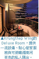 Suree 介紹時指出,曼谷香格里拉是公認世界上最好的酒店之一,除承襲香格里拉飯店集團既有的時尚、精緻、質感,與體貼入微的服務之外,最大的特色就是飯店內每間豪華客房都可欣賞到美麗的湄南河景。酒店內共分為主樓與Krungthep Wing兩棟大樓,共提供799間客房,其中包括52間套房。值得一提的是,Krungthep Wing以頂級、尊榮為訴求,不僅提供管家式服務,還可讓入住旅客在房間內完成Check-In入住手續。