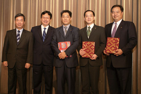 ▲(左起)北市公會東南亞委員會召集人吳雁輝、泰國觀光局台北辦事處處長陳漢明、荷航法航/台灣區經理溫爾功、長榮航空營業三課副課長陳龍江、中華航空台北分公司行銷策劃部經理郝光復。