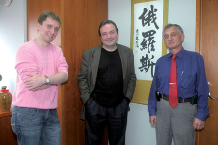 ▲莫北協在代表古博夫(中)、副代表白富多(右)以及領事事務組組長謝妙賦(左)以及全體工作同仁的努力之下,持續推動台俄交流的各項事務,背後的書法為國內知名的書畫家朱恆清所贈送的書法,而他也與代表為相知多年的老友。