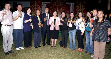▲清邁旅遊說明會結束後,泰國觀光局於清邁假日飯店舉辦晚宴,台灣同業一同向泰國觀光局局長Phornsiri Manoham(左6)敬酒表示謝意。(左起)雄獅旅行社批售部經理詹明穎、富邦旅行社宜蘭分公司負責人吳志賢、雅爾富旅行社李孝霞、Mr. Sansern Ngaorungsi-Regional Director of East Asia, TAT、大興旅行社董事長李人傑、花蓮縣旅行商業同業公會理事長孫菊生、泰國觀光局台北辦事處行銷&公關經理高菱憶、喜達旅行社總經理劉雙容、天海旅行社企劃黃秋甄、東南旅行社泰普線控林家慧、詠莉旅行社副總經理樓亞芬。