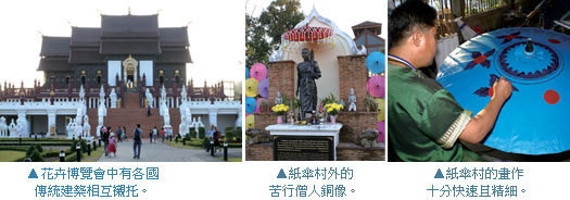 紙傘村的發跡與泰國的苦行僧有著莫大的關聯,紙傘村是由泰國苦行僧人出外苦行時在外學得的技藝,並將製作紙傘的技藝傳回泰國,並且發揚光大。現今紙傘村的泰國人為紀念這名苦行僧,特別在紙傘村的入口設置銅像,以表感念之意。紙傘村內以製作油紙傘聞名,在油紙傘上的畫作更是栩栩如生,此繪畫技術也用至服飾上,並可當場作畫,每一件畫作大約在50~100泰株,由於紙傘村的員工對於畫作都十分熟悉,因此,作畫僅需幾分鐘的時間即可完成。