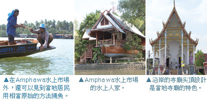 Amphawa水上市場坐落於從曼谷往西約70公里處的Samut Songkhram,以泰國本地觀光客為主要客群,放眼望去都是相當純樸的泰國民眾,每天下午會有賣家撐著船,載著自己要賣的物品上船販賣,不論是水果、漁獲、小吃統統可以找得到,雖然規模不如歐式水上市場廣大,但是麻雀雖小五臟俱全,岸上亦有商家開店販售商品。