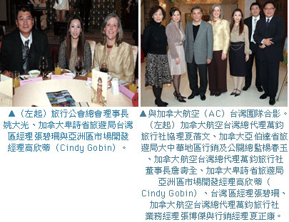 加拿大卑詩省與亞伯達省日前攜手舉辦「加西之夜」同業春酒聯歡晚會,由此次特地來台的加拿大卑詩省旅遊局亞洲區市場開發經理高欣蒂(Cindy Gobin)與兩省在台代表台灣區經理張碧珊與大中華地區行銷及公關總監楊春玉,共同設宴款待合作已久的旅遊同業。