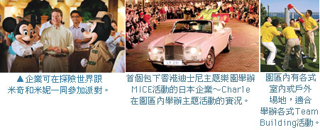 為推展MICE市場,香港迪士尼主題樂園早已設立專屬團隊,其中一組著重在推廣銷售,另一組則負責協助企業規劃相關活動。香港迪士尼樂園度假區旅遊市務經理陳超群則對香港迪士尼主題樂園發展MICE的優勢競爭力做了說明,她表示,「小組裡的專業人士,會將迪士尼樂園本身的『Magic』概念延伸、融入在MICE相關活動規劃裡,協助規劃在如童話世界般的主題樂園、主題飯店舉辦各式與別不同的活動,務求提供企業與員工極致夢幻又魔幻的MICE旅遊經驗。」