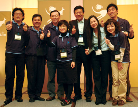 ▲澳洲旅遊局北亞區總經理倪建華、台灣區經理林芳如(左5、6)與台灣企業代表合影,(左起)精联保險經紀人公司業務部副理夏冠民、美商國際日健公司台灣分公司總經理謝忠道、美商玫琳凱台灣分公司財務暨營運協理王建華、ING安泰人壽業務活動處競賽活動科鍾奇芳、信義房屋總管理處人事部職能發展組主任佘雅雯、 安麗日用品公司業務處會議及專業活動主任黃覺緯。