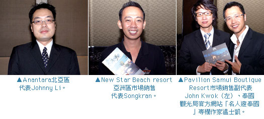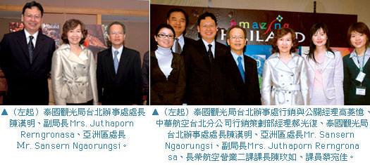 泰國觀光局台北辦事處行銷與公關經理高菱憶補充,台灣旅客對於海灘休閒的旅程情有獨鍾,而泰國其實就擁有各式風格的海灘及島嶼,如適合家庭旅遊的華欣、水上活動刺激豐富的普吉巴東海灘、蜜月旅行首選的寧靜島嶼天堂—蘭塔島…等,都是泰國夏季人氣景區之一。同時,在醫療旅遊盛行的此時,泰國也有世界知名診所、SPA傳統治療中心供遊客選擇。甚者,最近興起的「72小時魅力遊泰國」,泰國觀光局也提供數條不同路線給業者與消費端做動線參考,其中「博物館及展覽文化薰陶之旅」、「異國情調水上市場之旅」、「萬事達卡特別私房之旅」…都是相當人氣熔ㄚ~,對台灣市場而言,或許週五下班後出發,週一早上再回返,帶回的是觀光回憶與徹底的身心放鬆,此般商機亦不容小覷,並且,近日發表的世界旅遊評比中,泰國榮登最為物超所值的旅遊國度殊榮,更可證明泰國觀光歷久不衰的魅力與實力。