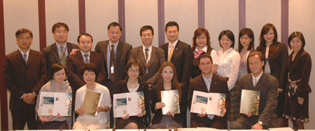 張碧珊(前排左4)特別邀請操作中高檔FIT加拿大產品的業者參加說明會,挾著「溫哥華最頂尖飯店」之光環,吸引多家業者到場聆聽。