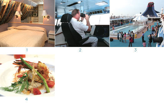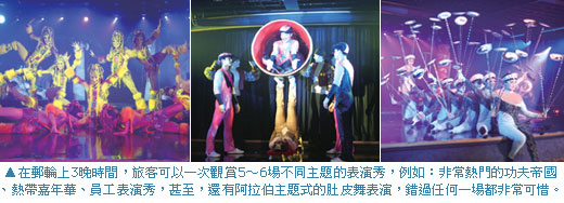 4.天秤星號上提供一日6餐之服務,航海家自助餐、海華宮、四季餐廳等旅客都可免費品嚐,並有24小時提供餐飲的藍湖咖啡座,旅客絕對吃好又吃飽。