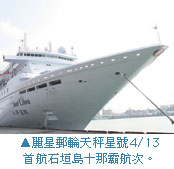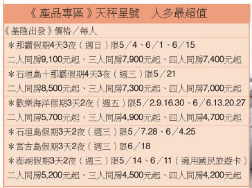 石垣島+那霸假期4天3夜,由基隆出發前往石垣島及那霸進行雙島航程,抵達石垣島後旅客有3種路線可參加,分別是八重山民俗村—BANNA展望公園—川平灣及超市購物行程、再者是竹富島—川平灣—桃仁寺及超市購物行程,第三是龍宮城鐘乳石洞—桃仁寺—川平灣等行程,旅客可欣賞到不同的日式風情。除了石垣島的景區豐富之外,那霸地區主題行程更有趣,包含那霸新都心、國際通購物之旅;沖繩森林健康樂活之旅(東南植物園、亞洲藥草花園);沖繩民俗文化之旅(文化王國玉泉洞、太鼓秀、海軍司令壕);海洋公園之旅(海洋博公園、水族館)及美食賞味之旅]牛排館、新都心)等,一次感受雙島趣樂遊。