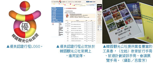 「優良認證」仍是2008韓國觀光公社努力推廣的重點之一。韓國觀光公社認證的行程依照商品季節性的特質,每次行程認證期限為3個月,期滿後如果商品可繼續販售也可以透過簡單的公文申請認證期間延長。認證的條件將從飯店、早餐、購物站、販售照片等問題,一一為旅客把關,目的是希望提供消費者更有保障的選擇,相信對業者品牌的定位及口碑的建立,也會有很大的幫助。公社也針對「優良認證」的旅遊產品給予廣告支援,並將行程公告於韓國觀光公社中文的官網上供所有的會員瀏覽。