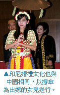 台北市國際婦女協會於5/27舉辦月例會,會員由各國大使夫人與台灣婦女組成,本月例會介紹印尼文化,駐台北印尼經濟貿易代表處代表費立也偕同夫人共同參與例會,並由費立的女兒擔綱示範印尼婚禮流程。印尼婚禮必須經過「希拉慢」、「松根慢」、「多多達味」等儀式才算完成婚禮。