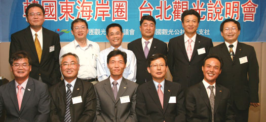 ▲(前排左起)蔚山廣域市觀光課觀光企劃擔當李埰碩、江原道觀光商品係長金旺起、慶尚北道觀光產業課長郭真旭、蔚山廣域市觀光課觀營銷係長吳泰垠、韓國觀光公社台北支社支社長韓和埈;(後排左起)復興航空協理姚祖亮、喜遊旅行社董事長鄭忠全、喜麟旅行社副總經理邱國勝、大韓航空總經理李鍾赫、韓亞航空總經理朴憲榮、新奇旅行社總經理王振益。