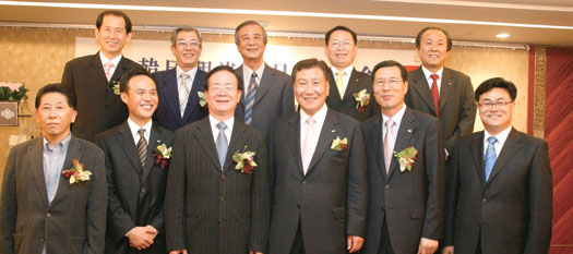 ▲(前排左起)韓國作人旅行社代表理事王作人、韓國觀光公社台北支社支社長韓和埈、財團法人台灣觀光協會會長張學勞、韓國一般旅行業協會會長鄭宇植、韓國醫療觀光代表理社/社長金容震、韓國一般旅行業協會事務局長金永洙;(後排左起)仁川世界都市祝典組織委員會觀光Leisure本部Team長/事務官柳志上、觀光局首爾辦事處所長王仁德、台灣觀光協會顧問兼東北亞市場執行長曾前訓、新奇旅行社總經理王振益、韓國一般旅行業協會常勤副會長金鎮昊。