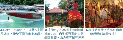 此為具有十分多元內容的旅遊景點,包括花園、傳統舞蹈表演、武術表演、宗教儀式、大象表演等等,十分適合操作團體旅遊。其中最令人印象深刻的當屬大象表演,在「Nong Nooch Tropical Garden」裡的大象受過多項訓練,從踢球、踩腳踏車到射飛鏢,每一項演出都令旅客大飽眼福,此外,園區內還安排有與動物合照的付費活動,旅客可以選擇與紅毛猩猩、大象、老虎或鸚鵡等等的動物合照,還可以向工作人員購買香蕉餵食大象,許多與動物近距離的互動是此一園區裡最特別的體驗。