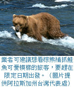 另一個主打行程「阿拉斯加內灣棕熊尋奇7日之旅」部分,任婉瑜表示,此行程是以生態奇景為主題,安排前往安娜野生生物和熊之觀測所,有機會親眼目睹野生熊覓食鮭魚之自然生態絕妙奇景。若旅客想看身懷絕技的棕熊捕抓鮭魚洄游躍起的奇景,最佳時間為6月底到8月下旬,故此行程為限時限量的特有團,7/18、25與8/1、8、15、22、29為最佳出發時間。