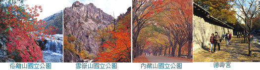 雪嶽山、內藏山、智異山、漢拏山、北漢山、雞龍山、俗離山及雉嶽山等都是韓國境內最受歡迎的賞楓國立公園,其中尤其以「雪嶽山國立公園」秋楓最為出色,而每年的9月底~10月中旬是到訪韓國賞楓的最佳時段。