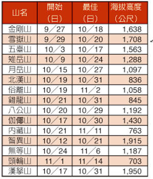 而氣象廳所公布的楓紅日期是依據楓紅面積而定,當楓葉暈染總面積達到20%時,是為楓紅的開始日期,而全盛時期則是指紅楓已達總面積的80%。9╱27從北韓金剛山開始轉紅的楓葉,經雪嶽山逐漸向南暈染,估計在11╱1左右韓半島南端的海南頭輪山也將進入賞楓期。另外,位於南端的漢拏山在10╱31等地陸續進入楓紅全盛期,業者可依適合賞楓日期規劃行程。