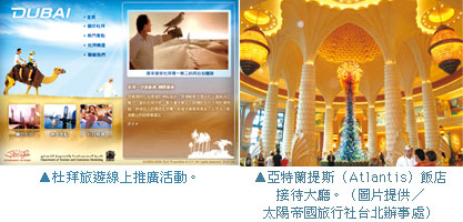 網站上亦精心挑選了多個5星級杜拜酒店及航線資訊供旅客選擇,讓遊客可以找到品味及入住環境適合自己預算的組合。太陽帝國旅行社台北辦事處業務經理方月秀表示,杜拜棕櫚人工島上首間度假酒店亞特蘭提斯(Atlantis)已正式營運,目前訂房狀況相當踴躍,除了多間尊貴客房及套房外,其水上樂園Aquaventure、巨型水族館The Lost Chambers以及與海豚暢泳的Dolphin Bay,都是旅客樂而忘返的重點遊覽區塊。