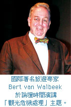 15日的SKAL觀光論壇,主題是「觀光危機處理」,演說者為國際著名旅遊專家Bert van Walbeek。論壇上,他提到波灣危機的時候,觀光產業面臨大蕭條,他正被任命為喜來登酒店集團中東地區的市場副總裁,負責跨5個時區的26家酒店市場推廣工作。當時他並不畏懼逆境,採取大膽策劃的另類策略,藉著穩定員工情緒與精準廣宣的方式,反而獲得營收上的亮眼成績,廣受各界支持與肯定,接續還為喜來登酒店和埃及旅遊促進管理局規劃推出旅行產業重建計畫,協助產業順利度過生意蕭條的難關。