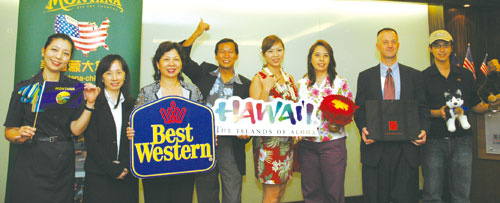 ▲(左起)美國旅遊推展協會執行長王美美、Oh!America教育顧問中心經理林靜漪、貝斯特韋斯特國際旅館集團經理韋光蘋、夏威夷觀光局代表施春庭╱公關暨行銷經理賴儀穎╱行政主任文馬琳、美國在台協會商務組高宇文。