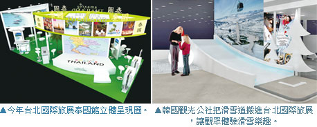 韓國觀光公社為了讓台灣旅客感受到韓國冬季滑雪樂趣,今年首度將ITF結合Fun Ski的活動,將滑雪道的極限樂趣搬到旅展會場;同時,今年韓國館展攤再擴增到20個,將韓國地方道縣風情呈現給台灣的民眾,包含濟州特別自治區、江原道、京畿道、慶尚北道及蔚山廣域市等6個單位;來到韓國館還有專屬體驗區,包含韓服體驗、投壺遊戲、食客體驗、體驗亂打以及韓國大會考等,讓韓國館更為有趣。