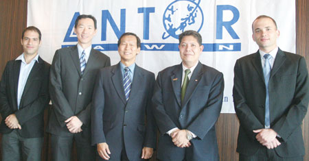 ▲ ANTOR新會員和會長合影,(左起)駐台北以色列經濟文化辦事處特助魏卓生、香港旅遊發展局台灣處長王萬民、夏威夷觀光局駐台代表暨ANTOR現任會長施春庭、馬來西亞觀光局台灣區副處長諾曼、駐台北以色列經濟文化辦事處經貿處處長高爾。
