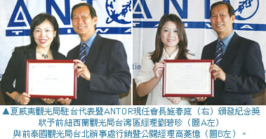外國駐台觀光代表聯合會(ANTOR)近日舉辦午宴餐會,除了歡迎新加入的成員與討論新一季的活動規劃外,對於即將離開組織的前紐西蘭觀光局台灣區經理劉碧珍(圖6A左)與前泰國觀光局台北辦事處行銷暨公關經理高菱憶(圖6B左),現場也以照片播放的方式讓會員們回憶2位夥伴多年來與 ANTOR一起成長的回憶及畫面,氣氛溫馨。夏威夷觀光局駐台代表暨ANTOR現任會長施春庭表示,新竹與台中的旅行業商談會順利完成,感謝會員的合作,今年台北國際旅展ANTOR將會有1個攤位,亦會需要會員們協力支持。而11月預計規劃會員朋友到中華航空與長榮航空的拜會,12月h有聖誕派對與ANTOR15週年的紀念活動,並且泰國Outing與新任會長的選舉事宜亦即將展開,會員們如有針對議題有相關建議,可以透過電子信箱的交流,一同完善會務的順利推動。(撰文.攝影>林庭逸)