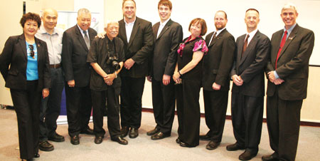 ▲ 阿拉斯加攝影展會場吸引許多貴賓支持,(左起)廉宏旅行社總經理賴婉庭、參展攝影師洪家輝、錫安旅行社董事長吳西謙、參展攝影師秦凱、台北國際社區廣播電台節目主持人孟瑞克、阿拉斯加旅遊推廣協會國際行銷推廣部經理Jesse Carlstrom、安克拉治會議暨觀光局行銷推廣部經理Marsha Barton、費爾班克斯會議暨觀光局國際行銷推廣部經理Colin Lawrence、美國在台協會商務組高宇文、美國阿拉斯加州台灣代表處代表取藹文。