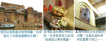 被印度人民稱為「聖河」以及「印度的母親」的這條世界知名的河流,無論是在宗教、文化以及民俗等各個層面,恆河對於印度的影響可說是深遠而廣泛。而稱為河壇(Ghat)的祭台,紛列於恆河的右岸,從12世紀僅有5座不斷增建,到百年前的60多座,各有其名稱以及用途功能,搭乘小船沿著河流前進,可看到人民在此洗滌、沐浴以至於舉行火葬的景象。而晚間所舉辦的點燈及祭火儀式(Evening Arti)也是參觀的重點之一。