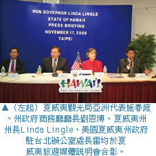 美國夏威夷州州長Linda Lingle近日訪台,除了拜會台灣政府代表、美國在台協會、航空業代表與企業外,也特別舉辦媒體說明會,期許此次來訪除了促進台灣與夏威夷州雙邊經貿關係,並提供最新旅遊訊息。